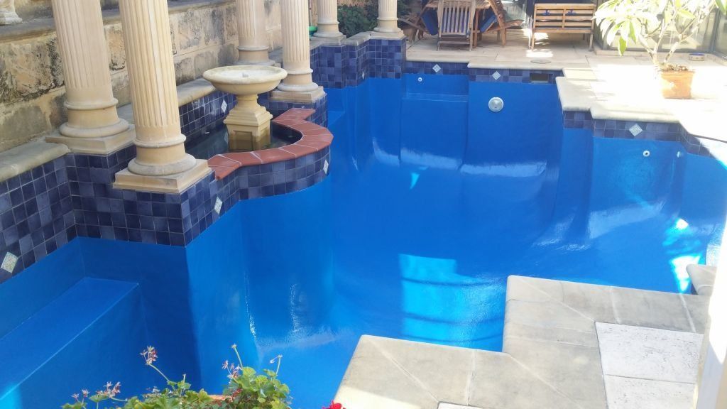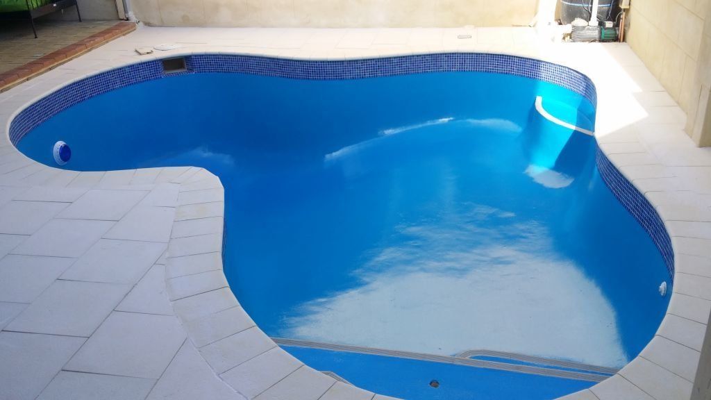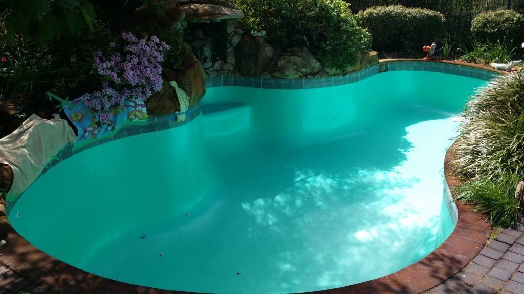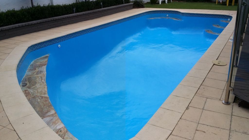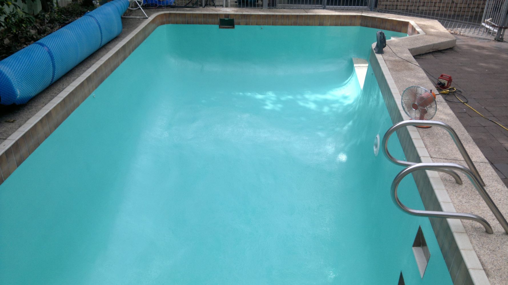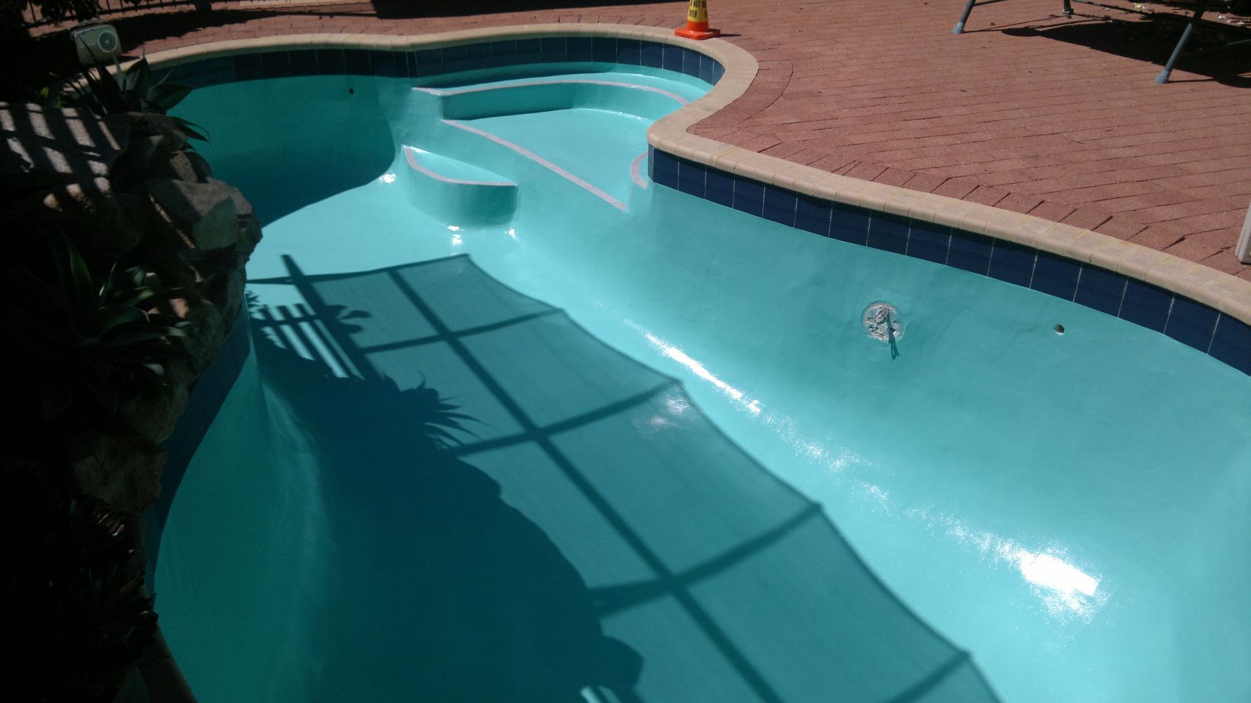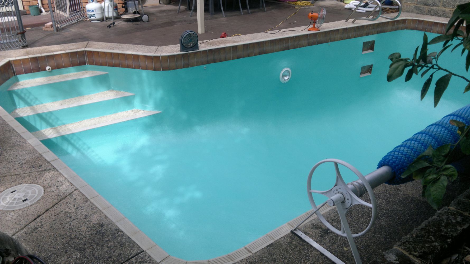 The above pool is coated in ADRIATICThis 1980 pool had no tile line. Bright & Blue installed a new mosaic tile line & coated the pool in ADRIATIC.